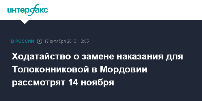 Саранск. 17 октября. INTERFAX.RU - Зубово-Полянский районный суд Мордовии в середине ноября рассмотрит ходатайство защиты осужденной участницы панк-группы Pussy Riot Надежды Толоконниковой о замене ей наказания на более мягкое.