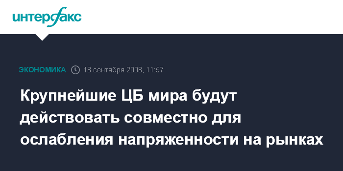 Москва. 18 сентября. INTERFAX.RU - Федеральная резервная система, Европейский центральный банк, Банк Японии, Банк Англии, Банк Канады и Швейцарский национальный банк объявили о проведении скоординированных шагов для ослабления напряженности на рынках.