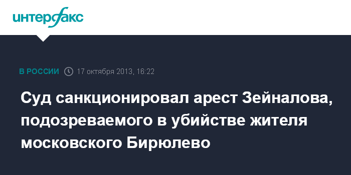 Москва. 17 октября. INTERFAX.RU - Гражданин Азербайджана Орхан Зейналов, подозреваемый в убийстве жителя московского района Бирюлево-Западное Егора Щербакова, заключен под стражу, передал корреспондент "Интерфакса" в четверг.