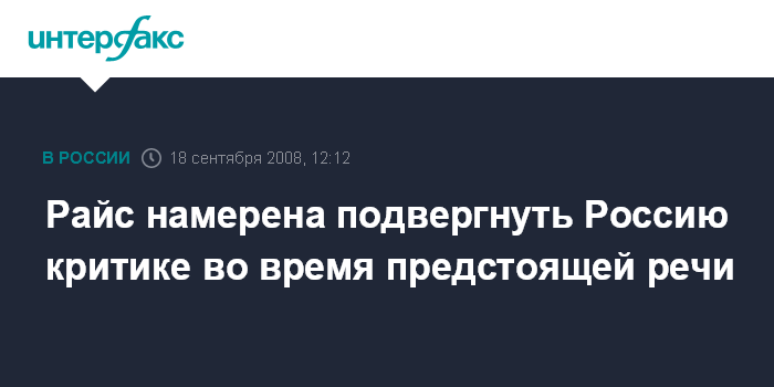 Нью-Йорк. 18 сентября. INTERFAX.RU - Госсекретарь США Кондолиза Райс намерена подвергнуть резкой критике Россию во время выступления в четверг в Фонде Маршалла, пишет газета New York Times, получившая доступ к отрывкам из ее речи.