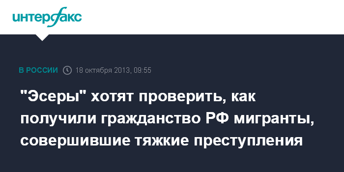 Москва. 18 октября. INTERFAX.RU - "Эсеры" готовятся внести в Госдуму законопроект об обязательной проверке того, как получили гражданство мигранты, ставшие россиянами в последние 10 лет, а также совершившие за это время тяжкие преступления.