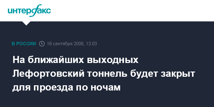 Москва. 18 сентября. INTERFAX.RU - По ночам в ближайшие выходные Лефортовский тоннель будет закрыт для проезда автотранспорта, сообщили "Интерфаксу" в пресс-службе мэра и правительства Москвы.