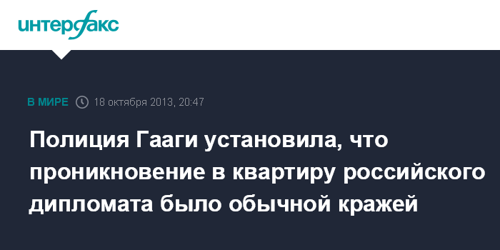 Москва. 18 октября. INTERFAX.RU - Несанкционированное проникновение в квартиру российского дипломата в Гааге было обычной кражей.