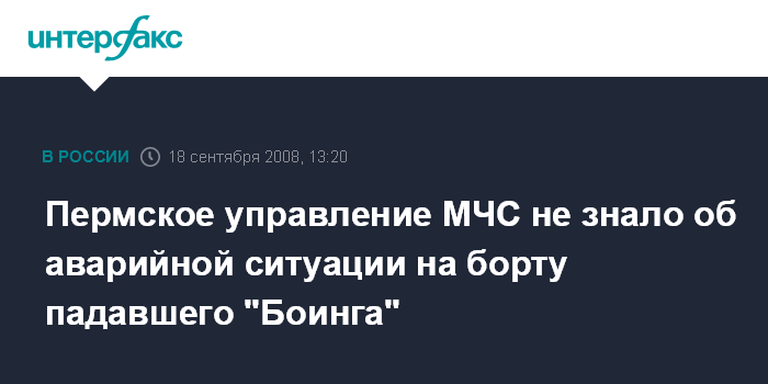 Пермь. 18 сентября. INTERFAX.RU - Представители ГУ МЧС России по Пермскому краю заявили, что они не знали о ситуации на борту "Боинга", который разбился в черте города на прошлой неделе.
