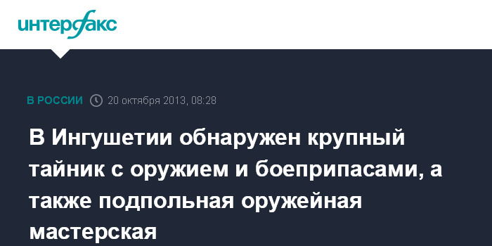 Москва. 20 октября. ИНТЕРФАКС - Большое количество оружия и боеприпасов, а также подпольная мастерская по изготовлению оружия обнаружены в окрестностях селения Экажево, сообщили "Интерфаксу" в правоохранительных органах региона.