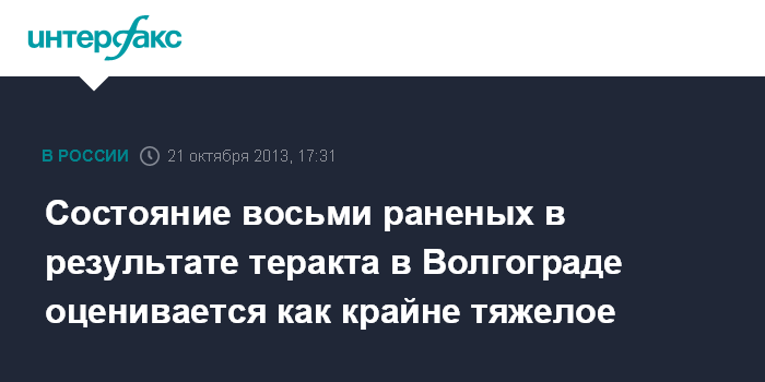Москва. 21 октября. INTERFAX.RU - Восемь пострадавших в результате теракта в Волгограде находятся в крайне тяжелом состоянии, сообщил "Интерфаксу" официальный представитель Следственного комитета РФ Владимир Маркин.