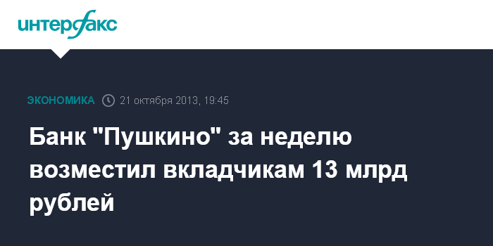 Москва. 21 октября. INTERFAX.RU - Вкладчики банка "Пушкино" за первую неделю получили страховое возмещение на общую сумму более 13 млрд рублей.