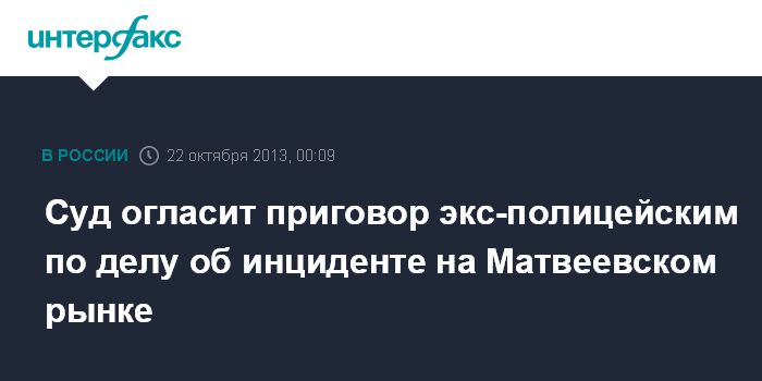 Москва. 22 октября. INTERFAX.RU - Никулинский суд Москвы во вторник огласит приговор бывшим сотрудникам полиции, обвиняемым в халатности в связи с инцидентом на Матвеевском рынке Москвы.