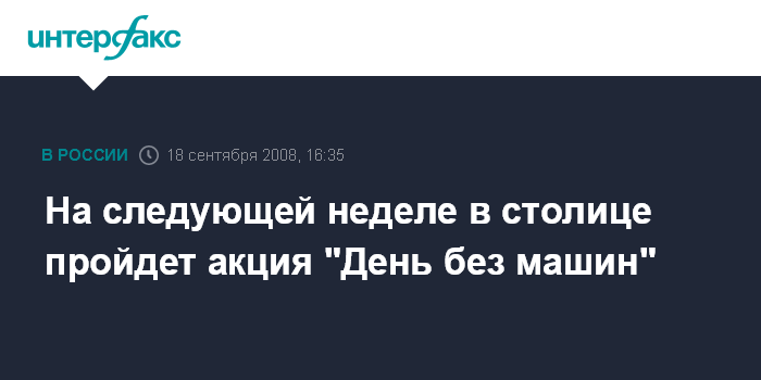 Москва. 18 сентября. INTERFAX.RU - "День без машин" пройдет в Москве в будущий понедельник. Мосгортранс, Всемирный фонд дикой природы и другие общественные организации призывают москвичей поддержать акцию, которая проводится в этот день во всем мире, заявил журналистам в четверг генеральный директор ГУП "Мосгортранс" Петр Иванов.