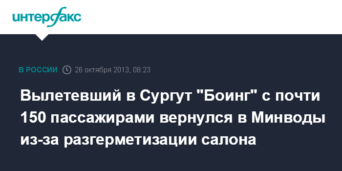 "В 23:00 мск пятницы пассажирский "Боинг", следовавший из Минеральных Вод в Сургут, совершил аварийную посадку в аэропорту вылета из-за проблем с разгерметизацией в салоне. Посадка пошла благополучно. На борту находились 146 пассажиров", - сказал собеседник агентства.