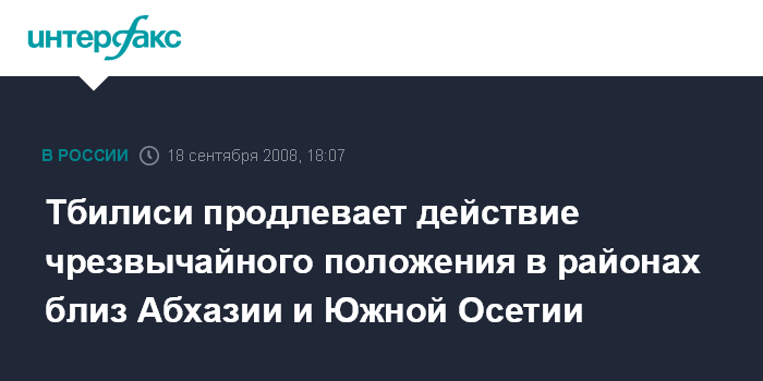 Москва. 18 сентября. INTERFAX.RU - Парламент Грузии в четверг продлил до 3 октября действие чрезвычайного положения в районах близ Абхазии и Южной Осетии, где остаются российские подразделения.