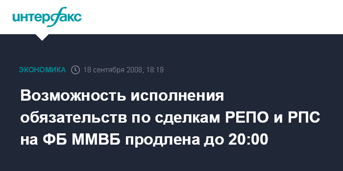 Москва. 18 сентября. INTERFAX.RU - Возможность исполнения обязательств по сделкам РЕПО и РПС на ФБ ММВБ 18 сентября продлена до 20:00 мск, говорится в сообщении биржи.