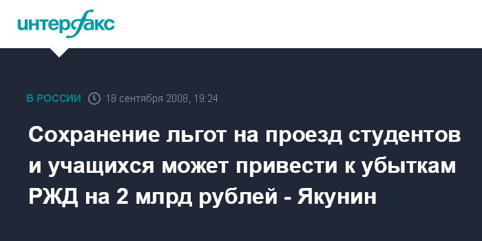 Сочи. 18 сентября. ИНТЕРФАКС - Убытки РЖД от сохранения льгот на проезд студентов и учащихся могут превысить 2 млрд рублей, заявил глава РЖД Владимир Якунин.