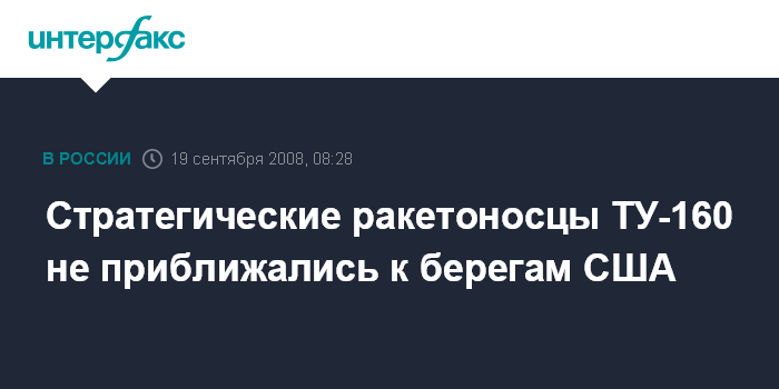 Москва. 19 сентября. INTERFAX.RU - Стратегические ракетоносцы ТУ-160, вернувшиеся в ночь на пятницу из Венесуэлы на авиабазу Энгельс в Саратовской области, не приближались к берегам США, сообщил журналистам помощник командира одного из экипажей, заместитель командира 121 полка Андрей Малышев.
