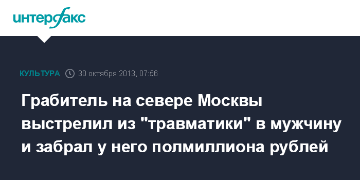 Москва. 30 октября. INTERFAX.RU - На севере Москвы грабитель выстрелил мужчине в лицо из травматического пистолета и похитил у него 500 тыс. рублей, сообщили "Интерфаксу" в среду в пресс-службе ГУ МВД России по Москве.