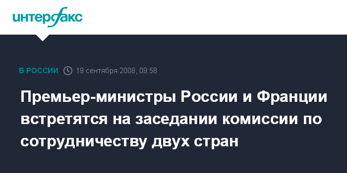 Москва. 19 сентября. INTERFAX.RU - Тринадцатое заседание российско-французской комиссии по вопросам двустороннего сотрудничества с участием премьер-министров Владимира Путина и Франсуа Фийона состоится в субботу в рамках VII Международного инвестиционного форума "Сочи-2008", сообщил источник в аппарате правительства РФ.