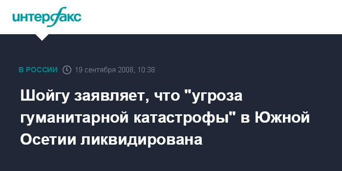 Москва. 19 сентября. INTERFAX.RU - В Южной Осетии ликвидирована угроза гуманитарной катастрофы и решены первоочередные задачи по налаживанию мирной жизни, заявляет глава МЧС России Сергей Шойгу.
