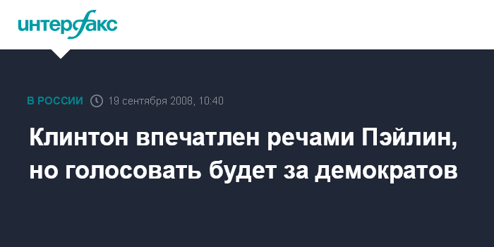 Нью-Йорк. 19 сентября. INTERFAX.RU - Бывший президент США Билл Клинтон признал, что выступления кандидата в вице-президенты страны от Республиканской партии Сары Пэйлин произвели на него сильное впечатление.