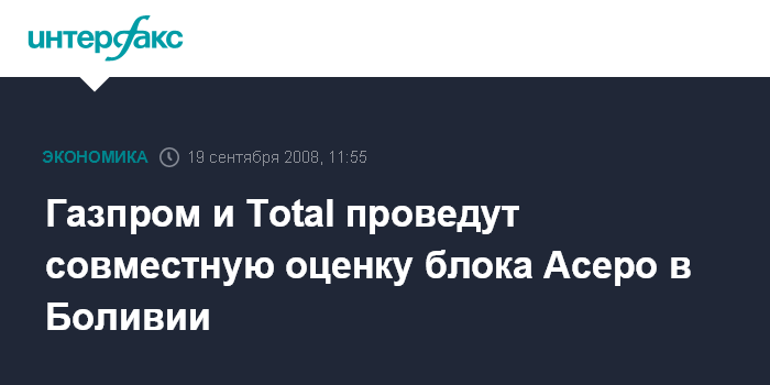 Москва. 19 сентября. INTERFAX.RU - ОАО "Газпром", боливийская госкомпания YPFB и Total E&P Bolivia подписали трехсторонний меморандум, который предполагает проведение совместной оценки блока Асеро.