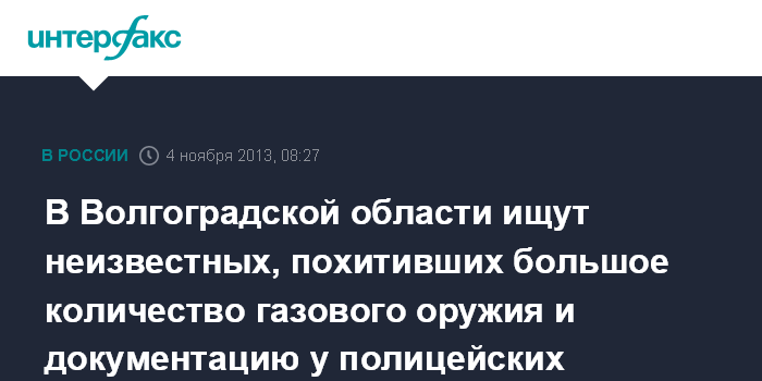 "Предположительно в ночь на воскресенье неизвестные, разбив окно, проникли в здание полиции общественной безопасности в городе Волжском и похитили в одном из кабинетов предположительно восемь единиц газового оружия, а также охотничье ружье и бланки документации, дающие разрешение на ношение оружия ", - сказал собеседник агентства.