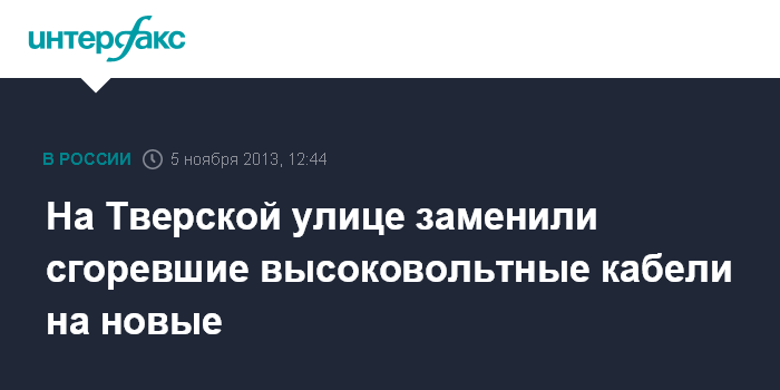 Москва. 5 ноября. INTERFAX.RU - Работы по перекладке высоковольтных кабелей в коллекторе на Тверской улице в понедельник были завершены, сообщил "Интерфаксу" источник в мэрии во вторник.
