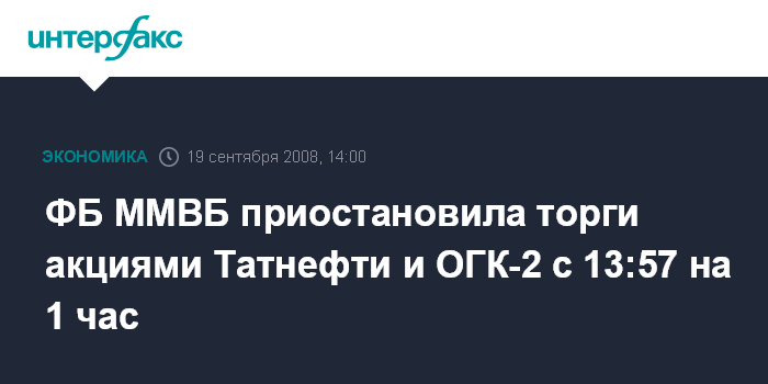 Москва. 19 сентября. INTERFAX.RU - Фондовая биржа ММВБ приостановила с 13:57 мск на 1 час торги обыкновенными акциями ОАО "Татнефть" и ОАО "ОГК-2" из-за их роста более чем на 10%, говорится в сообщении биржи.