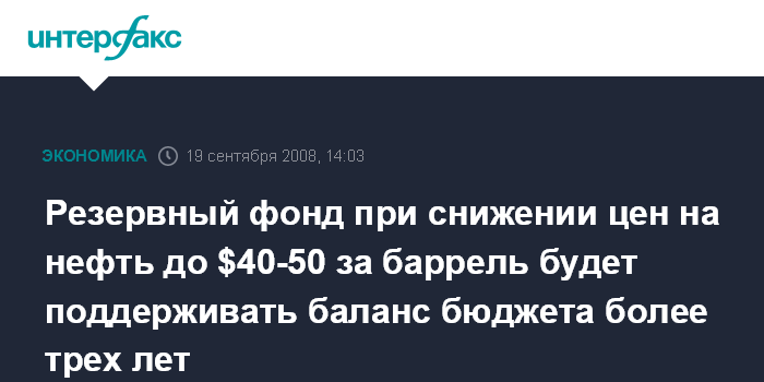 Москва. 19 сентября. INTERFAX.RU - При снижении цен на нефть до $40-50 за баррель для исполнения бюджета будет задействован Резервный фонд, и он будет поддерживать сбалансированность бюджета в течение более трех лет, сообщил, выступая в Госдуме, вице-премьер, министр финансов РФ Алексей Кудрин.