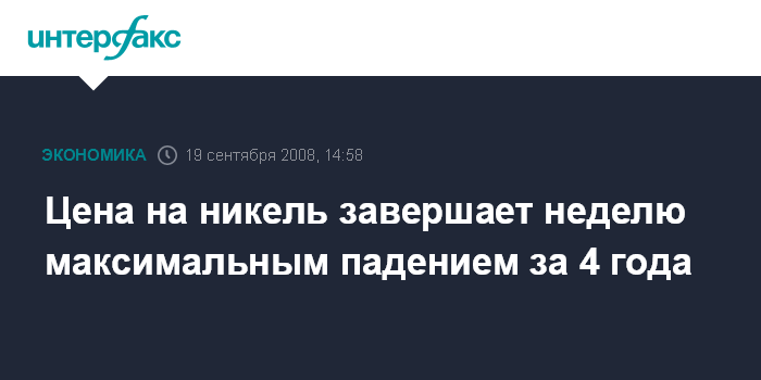 Москва. 19 сентября. INTERFAX.RU - Цена на никель завершает неделю максимальным падением за последние четыре года на фоне роста биржевых запасов этого металла до рекордного значения за 9 лет, сообщило агентство Bloomberg.