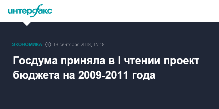 Москва. 19 сентября. INTERFAX.RU - Госдума на пленарном заседании в пятницу приняла в первом чтении проект федерального бюджета на 2009 г. и плановый период 2010-2011 годов.