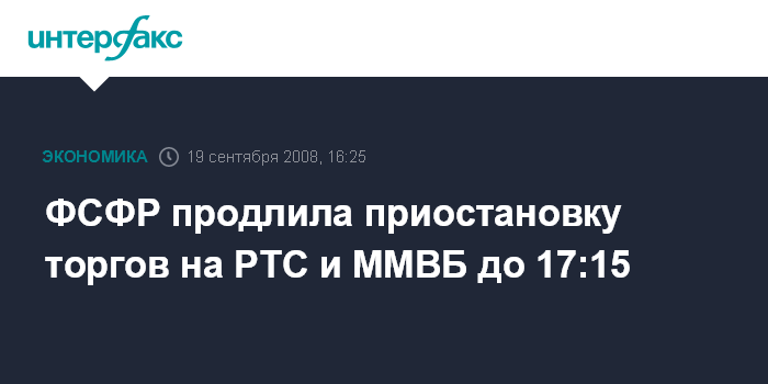 Москва. 19 сентября. INTERFAX.RU – Федеральная служба по финансовым рынкам (ФСФР) приняла решение о продлении приостановки торгов на биржах ММВБ и РТС до 17:15, сообщили агентству "Интерфакс-АФИ" в службе.