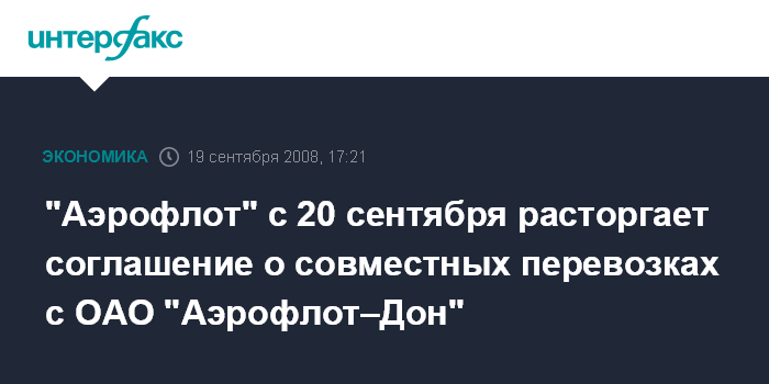 Москва. 19 сентября. INTERFAX.RU – ОАО "Аэрофлот - российские авиалинии" с 00:00 (мск) 20 сентября расторгает соглашение о совместных перевозках с дочерним ОАО "Аэрофлот-Дон", сообщили "Интерфаксу" в "Аэрофлоте".