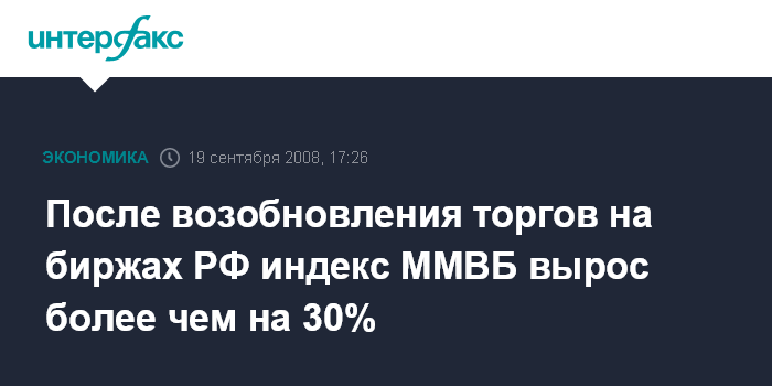 Москва. 19 сентября. INTERFAX.RU - После возобновления в 17:15 мск торгов на биржах РФ рост акций продолжился, индекс ММВБ вырос более чем на 30%, индекс РТС - на 21,3%.