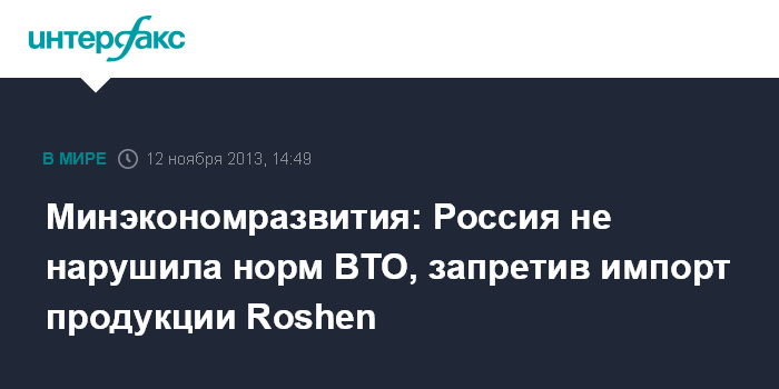 Москва. 12 ноября. INTERFAX.RU - Российские меры в отношении украинских конфет Roshen не нарушают норм ВТО, заявил директор департамента торговых переговоров Минэкономразвития РФ Максим Медведков журналистам во вторник в Москве.