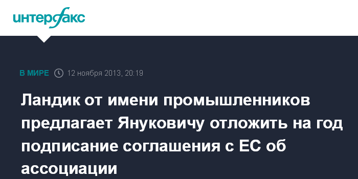 Киев. 12 ноября. INTERFAX.RU - Народный депутат Валентин Ландик предлагает президенту Украины Виктору Януковичу отложить на год подписание соглашения с Европейским cоюзом об ассоциации.