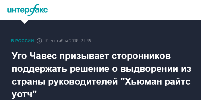Каракас. 19 сентября. ИНТЕРФАКС - Президент Венесуэлы Уго Чавес призвал сторонников выйти на улицы в знак поддержки решения венесуэльских властей о выдворении из страны двух высокопоставленных представителей американского отделения неправительственной правозащитной организации "Хьюман райтс уотч".