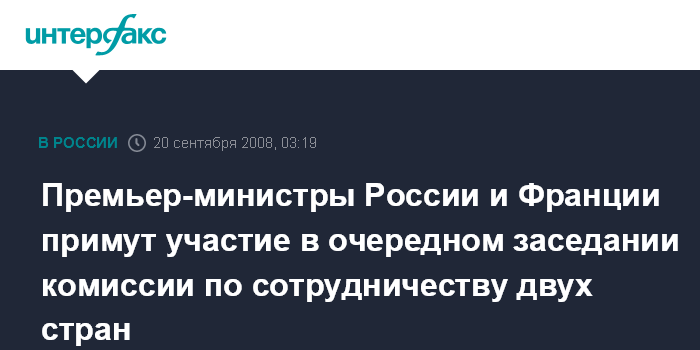 Москва. 20 сентября. ИНТЕРФАКС - Тринадцатое заседание российско- французской комиссии по вопросам двустороннего сотрудничества с участием премьер-министров Владимира Путина и Франсуа Фийона состоится в субботу в рамках VII Международного инвестиционного форума "Сочи-2008".