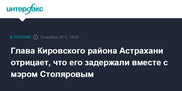Астрахань. 13 ноября. INTERFAX.RU - Глава Кировского района Астрахани Ширвани Автарханов заявляет, что опубликованная в СМИ информация о его якобы имевшем место задержании вместе с мэром Астрахани недостоверна и он будет требовать ее опровержения.