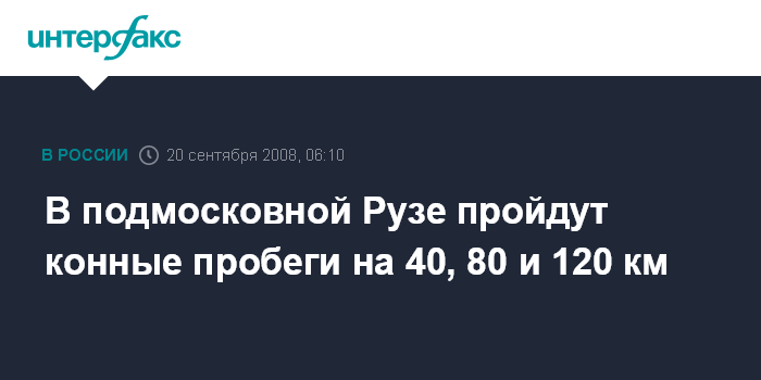 Москва. 20 сентября. ИНТЕРФАКС-ЦЕНТР - В подмосковной Рузе в выходные пройдут открытые соревнования по конным пробегам на 40, 80 и 120 км под названием "Рузский рейд: осень-2008", сообщили "Интерфаксу" в администрации Рузского муниципального района.
