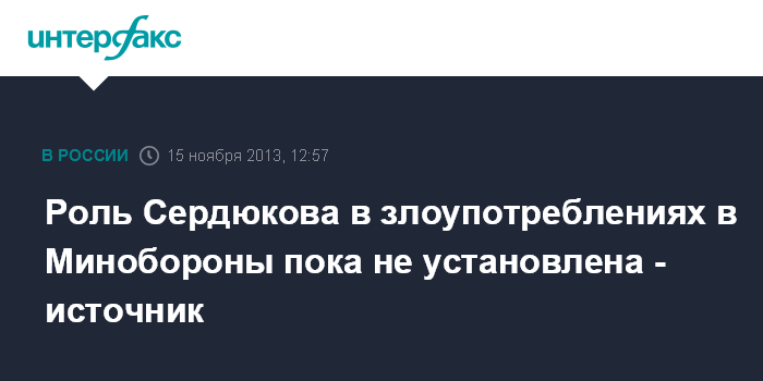 Москва. 15 ноября. INTERFAX.RU - Роль экс-министра обороны России Анатолия Сердюкова в злоупотреблениях в военном ведомстве, связанных с незаконным отчуждением имущества Минобороны, пока не установлена, исследования в этом направлении продолжаются, заявил "Интерфаксу" в пятницу высокопоставленный источник в правоохранительных органах.