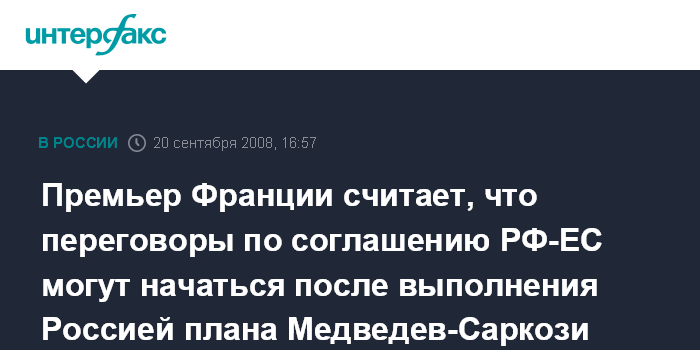 Москва. 20 сентября. INTERFAX.RU - Премьер-министр Франции Франсуа Фийон не видит оснований к продолжению моратория на возобновление переговоров о стратегическом партнерстве РФ-ЕС в случае, если Россия выполнит соглашение Медведев-Саркози по урегулированию ситуации на Южном Кавказе.