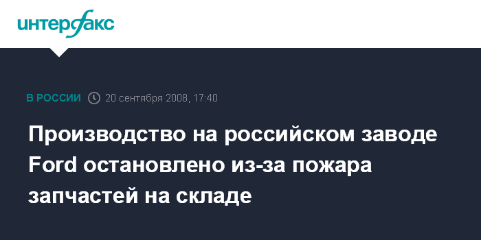 Москва. 20 сентября. INTERFAX.RU - Производство на заводе "Форд Мотор Компании" во Всеволожском районе Ленинградской области было приостановлено в пятницу вечером в связи с пожаром на складе, где хранились детали для автомобилей, сообщила "Интерфаксу" в субботу пресс-секретарь российского подразделения "Форда" Екатерина Кулиненко.