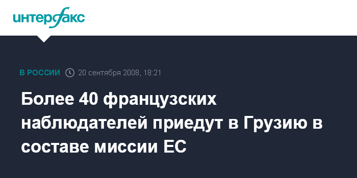 Москва. 20 сентября. INTERFAX.RU - Франция направит в Грузию более 40 своих представителей в составе миссии наблюдателей ЕС, заявил премьер-министр Франции Франсуа Фийон.