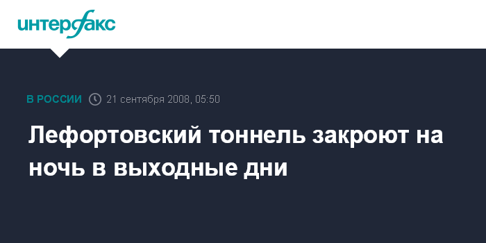 Москва. 21 сентября. ИНТЕРФАКС-МОСКВА - По ночам в ближайшие выходные Лефортовский тоннель будет закрыт для проезда автотранспорта, сообщили "Интерфаксу" в пресс-службе мэра и правительства Москвы.
