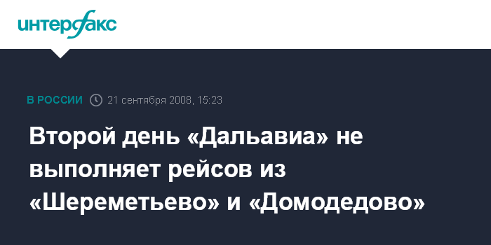 Москва. 21 сентября. INTERFAX.RU - Авиакомпания "Дальавиа" с субботы, 20 сентября не выполняет рейсов из московских аэропортов "Шереметьево" и "Домодедово", сообщили "Интерфаксу" в пресс-службе "Шереметьево".