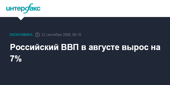 Сочи. 22 сентября. INTERFAX.RU - ВВП РФ в этом августе вырос на 7% по сравнению с августом прошлого года, сообщила журналистам руководитель Минэкономразвития РФ Эльвира Набиуллина в кулуарах форума "Сочи-2008".