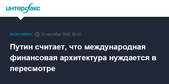 Сочи. 22 сентября. INTERFAX.RU - Премьер-министр РФ Владимир Путин заявил о необходимости подумать над изменением международной финансовой архитектуры в связи с мировым экономическим кризисом.