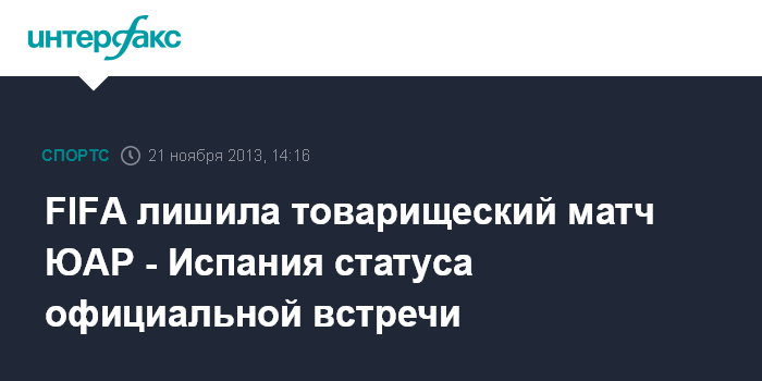Москва. 21 ноября. INTERFAX.RU - FIFA присвоила товарищескому футбольному матчу ЮАР - Испания (1:0) статус неофициальной игры, информирует EWN Sport.