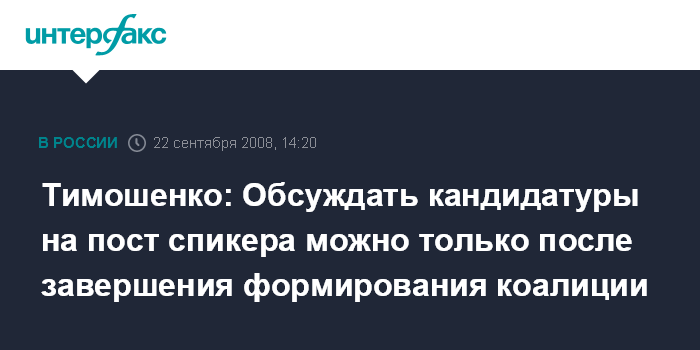 Москва. 22 сентября. INTERFAX.RU - Премьер-министр Украины Юлия Тимошенко заявила, что обсуждать кандидатуры на должность спикера парламента можно только после завершения формирования коалиции в Верховной Раде.