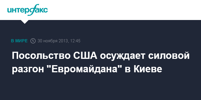 Киев. 30 ноября. INTERFAX.RU - Соединенные Штаты Америки осуждают силовой разгон митингующих в центре Киева и призывают правительство Украины к уважению принципов свободы слова и свободы собраний.