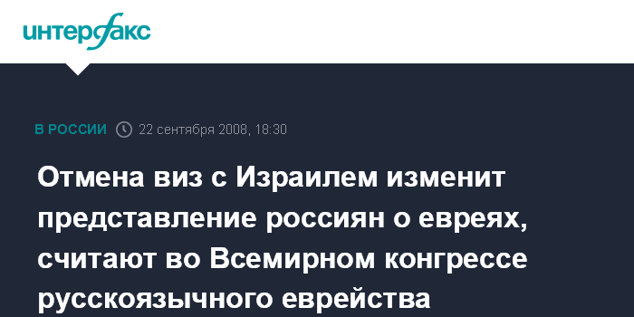 Москва. 22 сентября. INTERFAX.RU - Во Всемирном конгрессе русскоязычного еврейства надеются на то, что введение безвизового режима между Россией и Израилем изменит представление россиян о евреях и их стране.